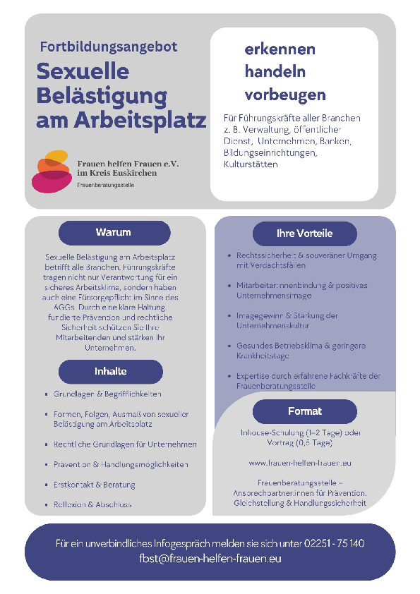 Unsere Mitgliedsorganisation Frauen helfen Frauen Euskirchen hat ein spannendes Angebot für Führungskräfte konzipiert, auf das wir gerne hinweisen: